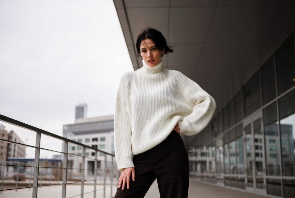 White sweaters with dark bottoms for contrast